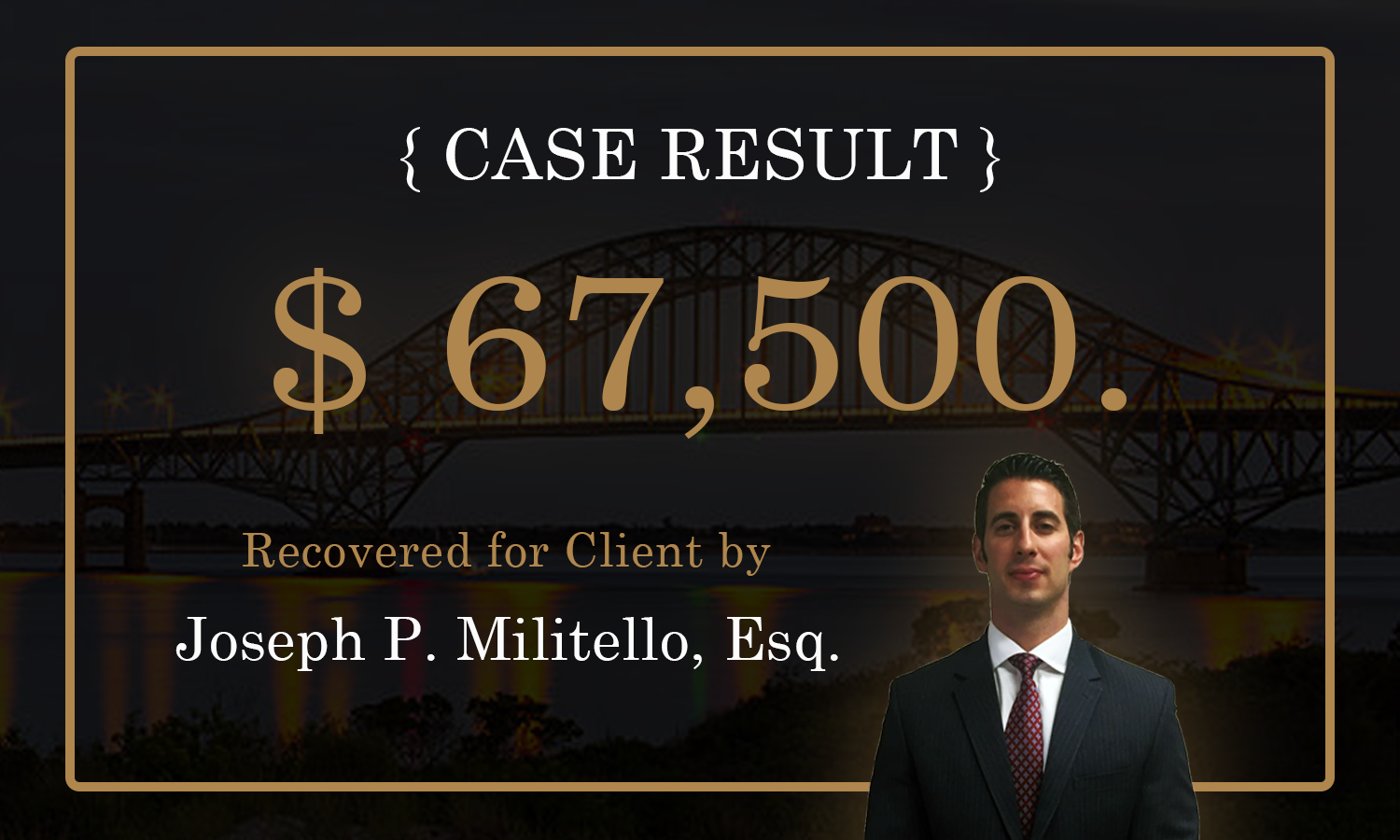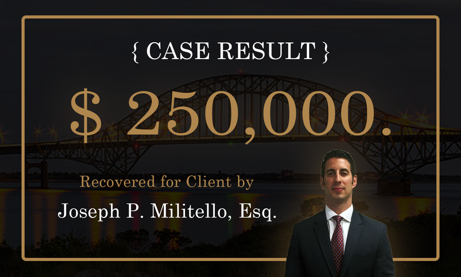 Motor Vehicle Accident - $250,000 for the victim of a motor vehicle accident, struck by a vehicle that made an improper left-head turn. As a result of the impact, the Plaintiff sustained back injury which required physical therapy, pain management and a minimally invasive spine surgery. The Defendants’ insurance company settled this matter prior to trial by tendering their entire insurance policy.