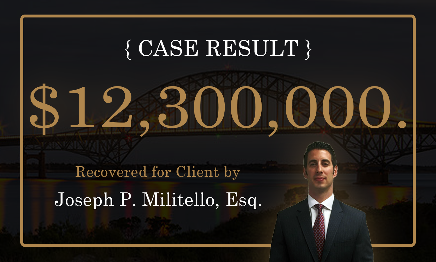 Motor Vehicle Accident - $12,300,000 for a roadway construction worker who was struck at high speed by a car and was very seriously injured. The case culminated in a 9-week long trial with the jury unanimously awarding a damages verdict in favor of the Plaintiff.
