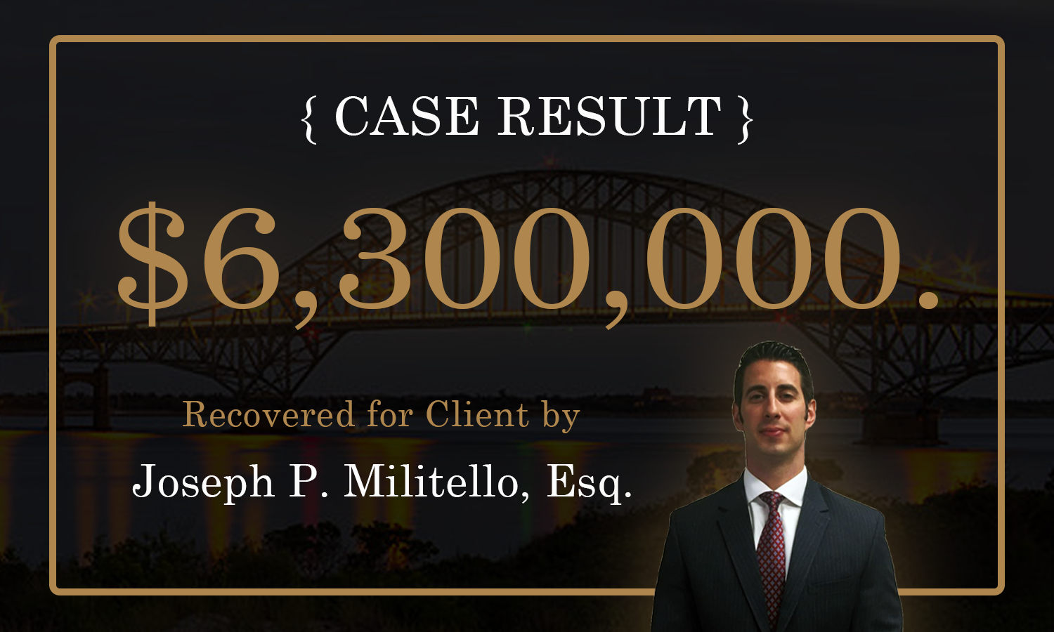 $6,300,000 for a construction worker that was injured when he fell 20 feet from a scaffold that had planks that were not tied down or secured in any way. The Plaintiff sustained injuries to his neck, back and left shoulder. Plaintiff was caused to undergo neck surgery, back surgery and left shoulder surgery. We were able to successfully negotiate a settlement in this matter during trial.