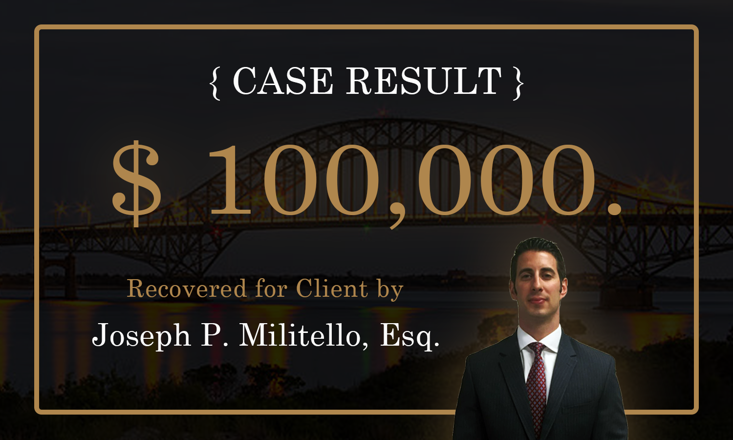 Motor Vehicle Accident - $100,000 for the victim of a motor vehicle accident, struck in the rear by a vehicle. As a result of the impact, the Plaintiff sustained neck and back injuries which required physical therapy and pain management. The Defendants’ insurance company settled this matter prior to trial by tendering their entire insurance policy.