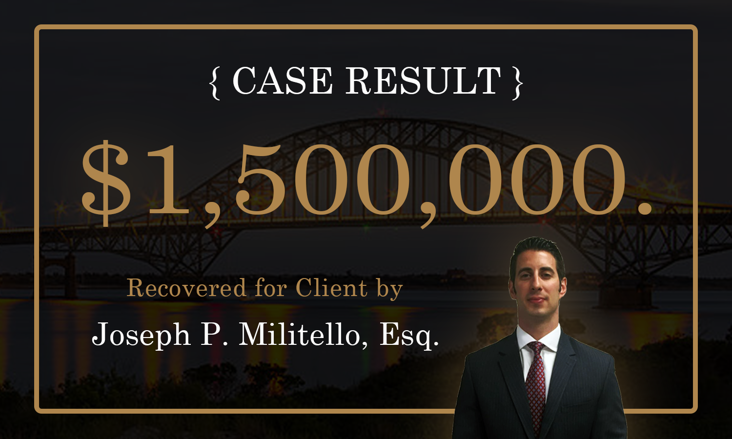 Motor Vehicle Accident - $1,500,000 for the victim of a motor vehicle accident, struck by a vehicle that disregarding a stop sign. As a result of the significant impact, the Plaintiff sustained multiple fractures. The Defendants’ insurance company settled this matter prior to trial through mediation.